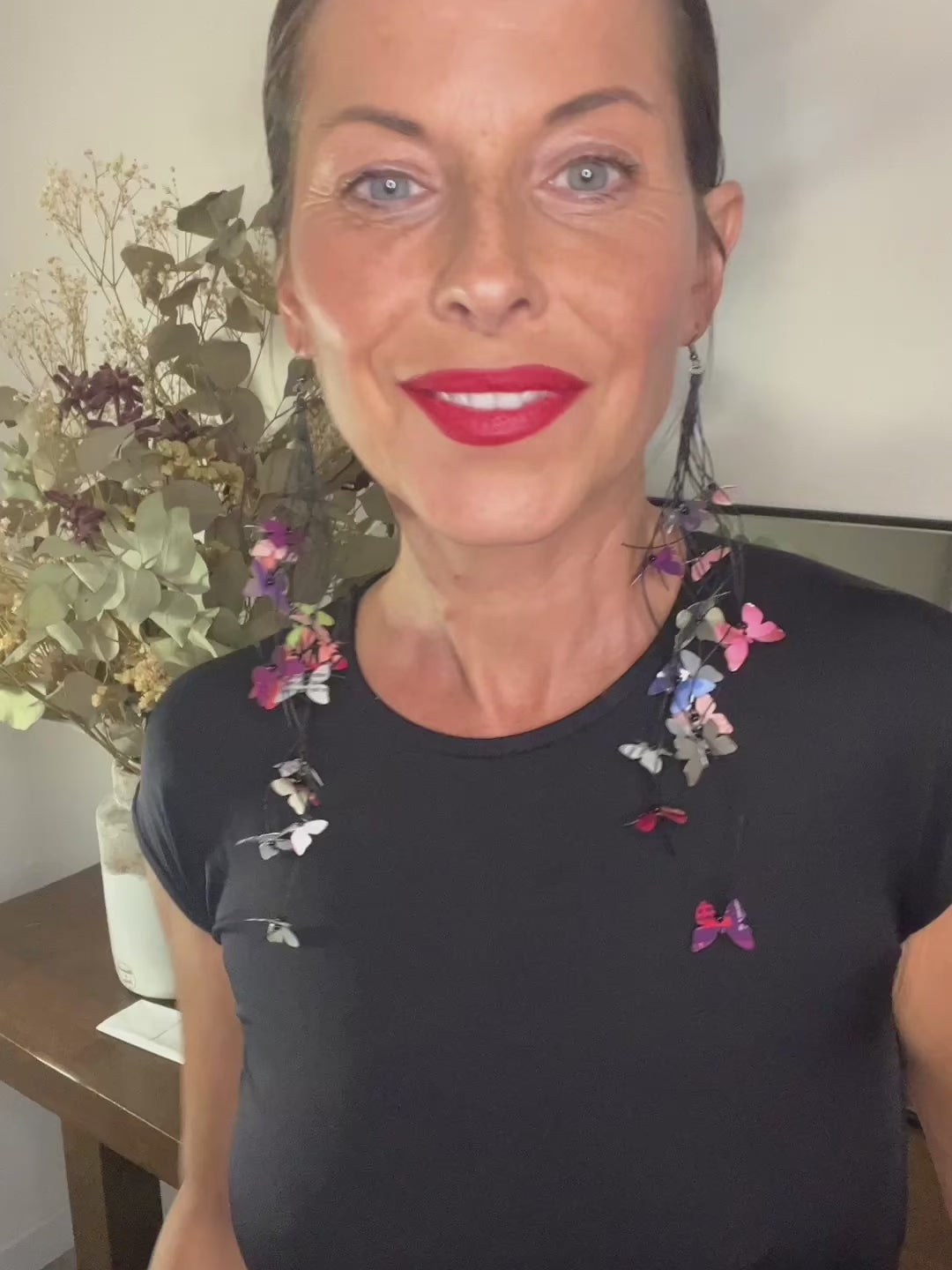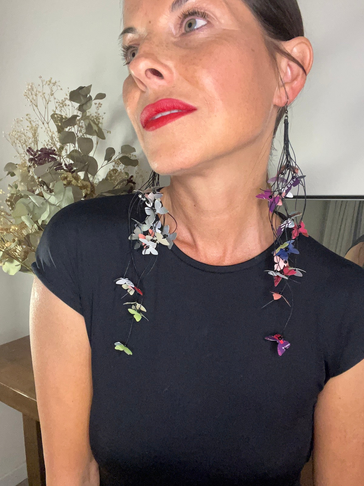 elegant, colourful necklace featuring tiny aluminium butterflies, each one is cut from soda and beer cans, fitted on multiple thin black waxed cotton cord on a wooden background