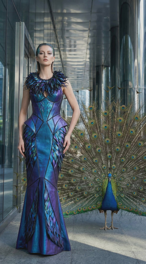 Finished in luminous metallic shades of blue, purple, and green, the colours echo the iridescent splendour of peacock feathers.